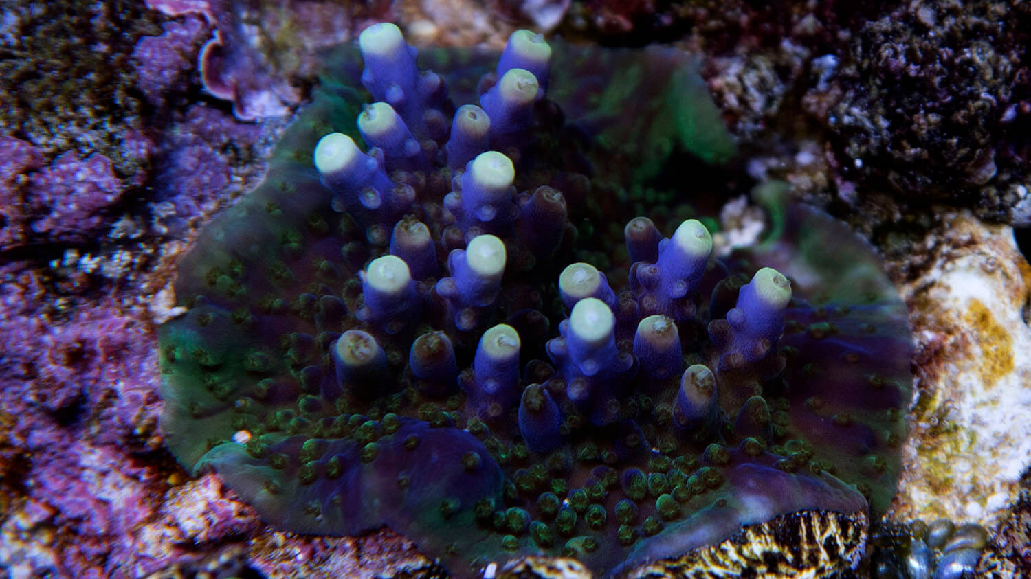 Solid purple body with green base and white tips and thick greenish polyps. the overall shiny purple color of this acro makes for a very desired coral.